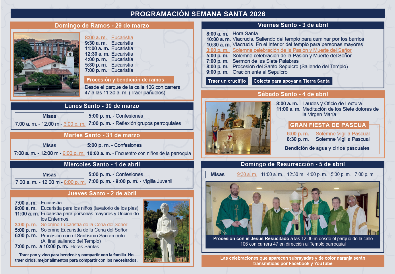Las celebraciones señaladas en color naranja las podrás ver por Facebook y YouTube.